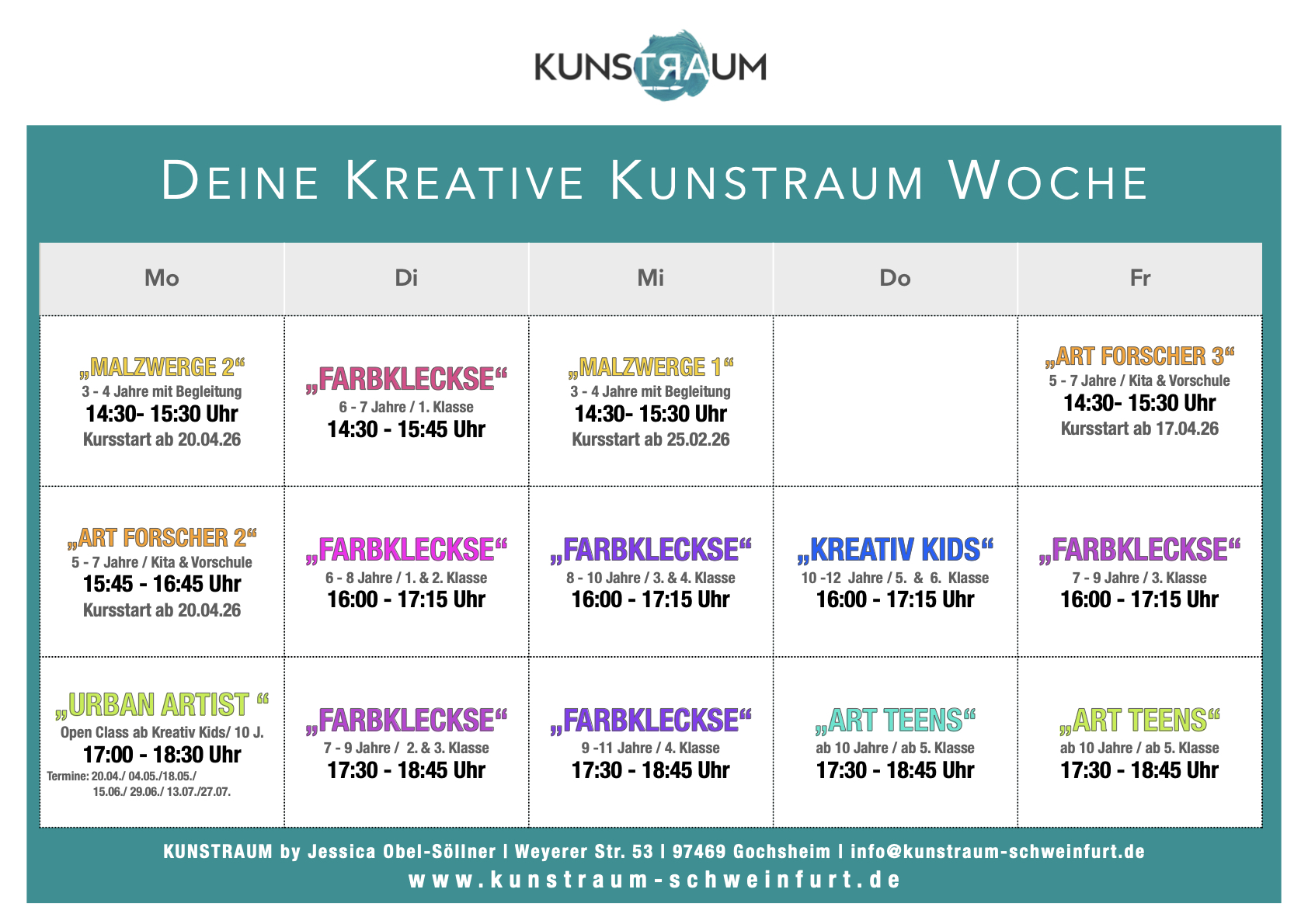 Ein ART-Semester besteht aus 4 Terminen á 60 min (Malzwerge & Art Forscher) oder 8 Terminen á 75 min und startet meist zu Beginn eines Quartals. Jeweils 15 min vor und nach dem Kurs sind unsere Hol- und Bringzeiten. Hier ein kleines Bsp.: