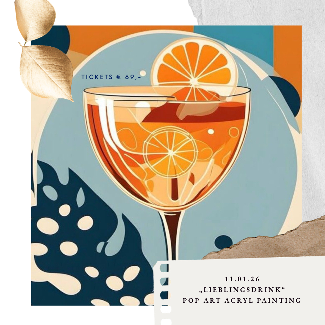 Wir stoßen gemeinsam auf das neue Jahr an. Male deinen Lieblingscocktail mit Acrylfarbe auf die Leinwand im Pop Art Style. Wähle aus verschiedenen Motiven aus und genießen einen kreativen Begrüßungsdrink dazu. Wir malen im A4 Format auf einen Keilrahmen mit Künstleracrylfarbe. Genieße einen tollen Sonntag mit leckerem Brunch und entspannten malen. Die perfekte Geschenkidee für dich oder deinen Herzensmensch.