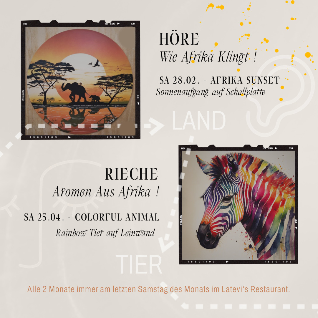 Es erwarten dich eine kunstvolle & kulinarische Reise für alle Sinne. Die Motivthemen begleiten dich zu LAND – TIEREN – MENSCHEN Afrikas. Die Plätze sind limitiert jetzt fehlst nur noch Du als besondere Zutat für ein unvergessliches Erlebnis beim gemeinsamen kreativen Schaffen!