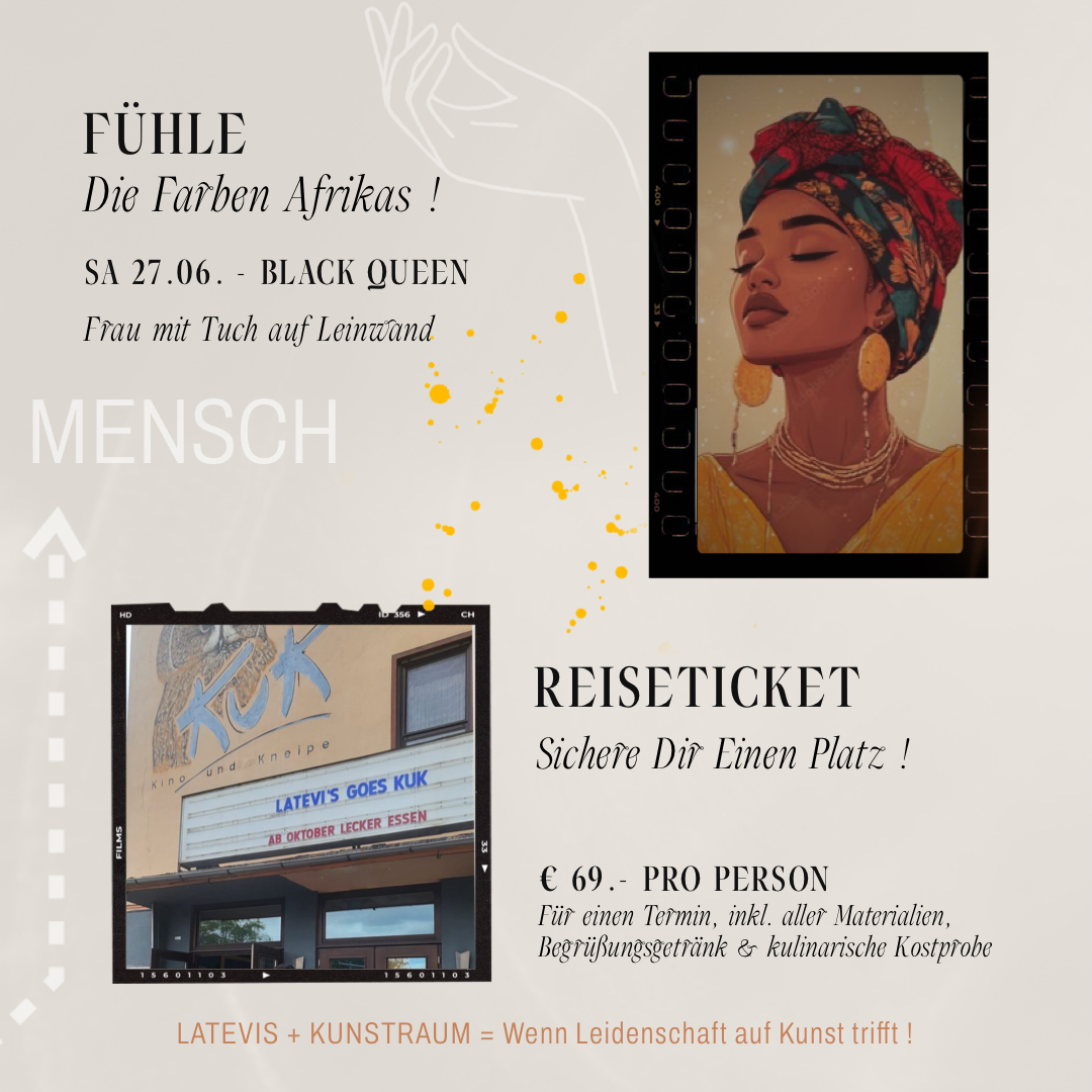 Wir malen ein Porträt Bild einer Frau mit Tuch als Kopfschmuck. Für das Muster des Kopfschmuckes lassen wir uns von Soffmuster Afrikas inspirieren. Jeder darf dabei sein, du brauchst keine Vorkenntnisse. Fühle den Zauber der Farben und Formen und genieße die herzliche Gastfreundschaft im Latevi´s. Schenke dir eine kleine Auszeit vom Alltag oder nutze dieses Event um dich mal wieder mit deinen Lieblingsmenschen zu verabreden.